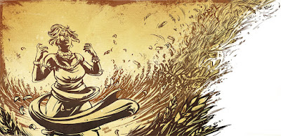 The twins were helpless and ashamed when Terra returned. They could not bare to tell her the truth of their failure. Instead, Tammuz stepped forward, told Korona's mother of her kidnapping and once again offered his services. Terra fell into a fury and sadness that rocked the world, crops spoiled and even burned, and the natural order began to break down. The gods held a council on the hill where Tammuz had played and the crime was committed. Tammuz was in awe of their majesty, kneeling before them, but a fair hand lifted him to his feet.